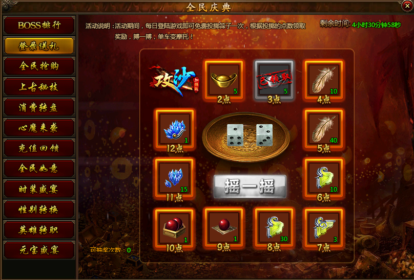 【活动说明】:登陆游戏即可免费投掷筛子一次,根据投掷筛子的点数来获得奖励
